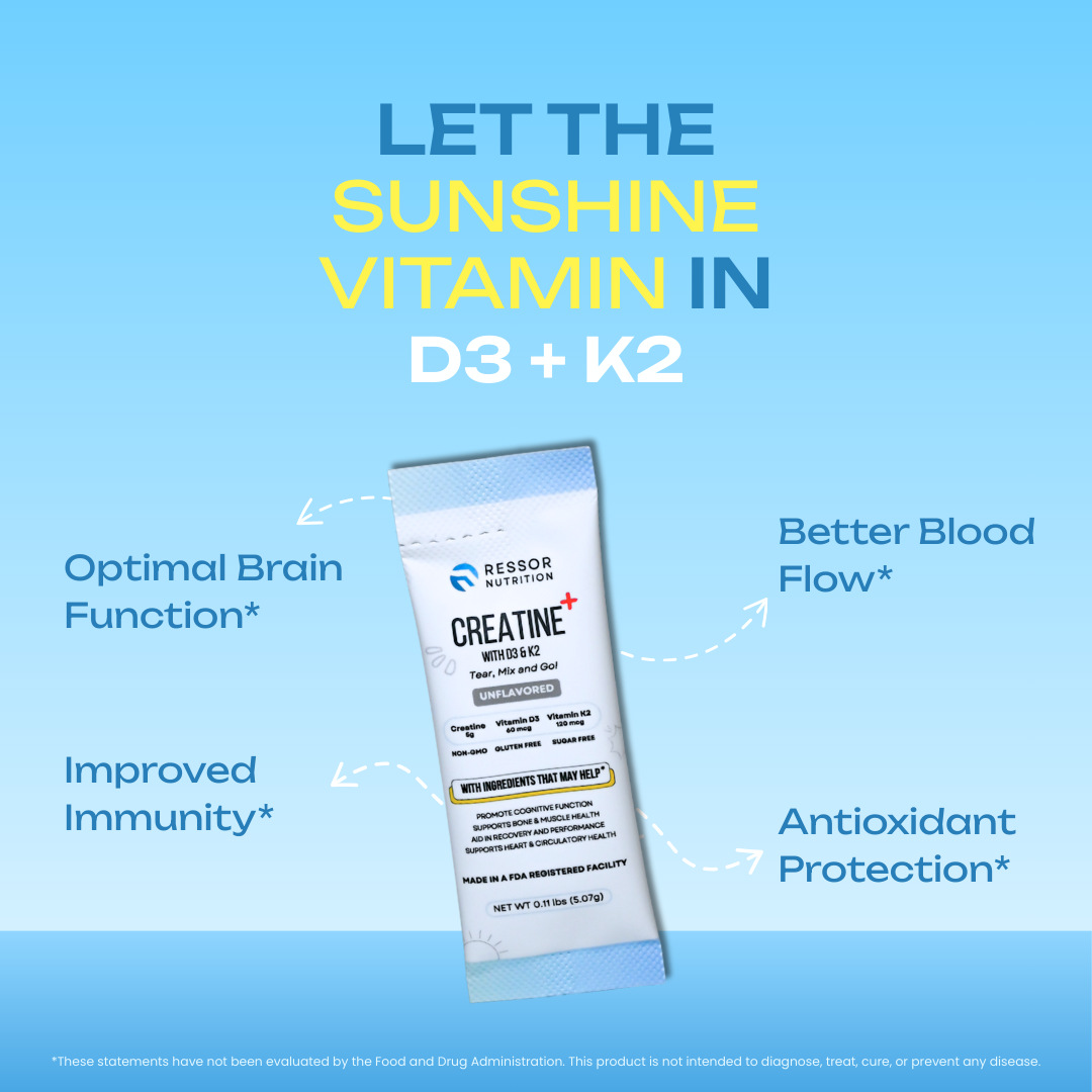 Experience enhanced energy and performance with Creatine +, enriched with D3 and K2. This powerful combination supports muscle growth, recovery, and overall health.